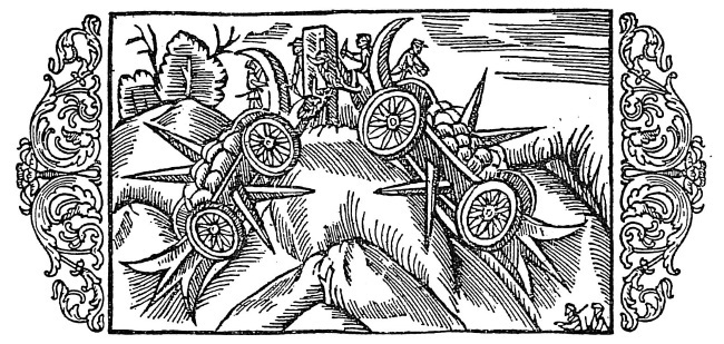 Довольно неожиданное использование «серпоносных колесниц» мы находим в истории шведского гуманиста, архиепископа Упсалы, Олафа Магнуса (1490–1558). В главе «De curribus falcatis» он рассказывает (De gent. Sept., IX,2)152, что «некогда воины шведов и готов153 в жестоких битвах против сильнейших войск тевтонов [немцев], данов и рутенов [русских] особенно использовали» серпоносные колесницы, вооруженные серпами и большими крюками. Об их применении Олаф рассказывает: «… разведав о прибытии врагов, которые кажутся подходящими, шведы привязывали пустые колесницы, с хорошо натертыми маслом осями, к крепким боковым стволам на склонах гор и устанавливали эти наполненные камнями колесницы, словно висячие мосты, на краях, отовсюду покрывая их цветущей листвой или сучьями; пока враги наступают, они торопливым притворным бегством двигались к прикрытым местам; и так же отвязанные колесницы быстро ехали и подвергали разрушению или разрывали те построенные клинья (aciales cuneos), которые надо рассеять. Когда это сделано, и те, кто прежде казались бегущими, а так же другие союзные не рассеянные или остановившиеся отряды (turmae), либо конные, либо пешие, обычно стройно нападают. Только эти колесницы, словно подвижные укрепления, были всегда, где нужно, использованы в оставшихся стычках; притом такой образ неприкосновенно соблюдается, что управляющий колесницей, или возница, получает в два раза больше жалования и добычи, чем всадники. Также и тем, что биги, или повозки, окруженные железными наконечниками, рвали противников, и тем, что они остриями (… ferratis cuspidibus… mucronatis) заставляли разбегаться врагов на бездорожье и крутизны, они подобны тому, что рассказывается в истории Курция о деяниях Александра».