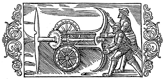 Оригинальный шведский аппарат, представляющий собой пропеллер из мечей, вертящихся посредством зубчатой передачи (XV- первая половина XVI в.). Отметим, что художник не изобразил доски, прикрывающие колеса, ведь враги могли просовывать свои пики между спицами колес, пытаясь остановить повозку.