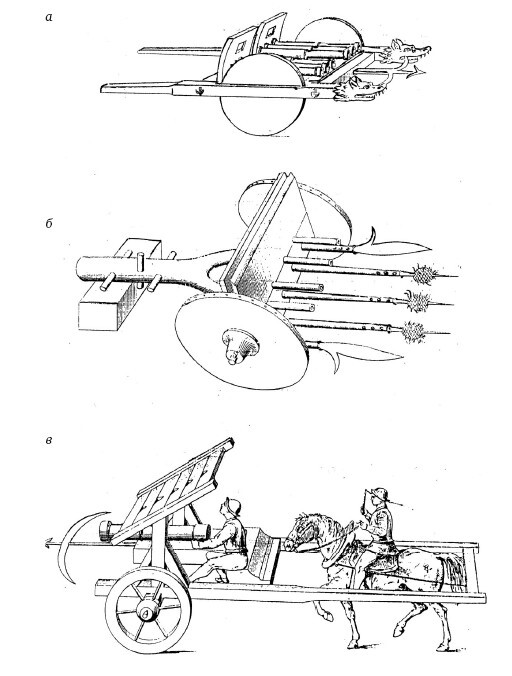 М. Вертело отмечал, что в XVI в. по мере развития артиллерии, исчезают и аппараты вооруженные остриями161. В арсенах германского императора Максимильяна I (1493–1519 гг.) еще имелись повозки, снаряженные косами, копьями и пищалями162. Однако уже в двух других манускриптах (немецком и итальянском) второй четверти XV в., посвященных военным машинам, мы уже не найдем информацию о вооруженных тележках, хотя в первой рукописи представлены современные повозки гуситов и кулеврина, прикрытая дощатой защитой, усиленной остриями163. Даже во время Тридцатилетней войны (1618–1648 гг.) применялись тележки с различными наконечниками164.