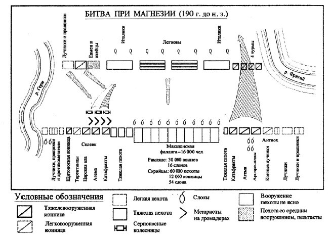 Противники, по-видимому, уже знали, как примерно будут построены отряды врагов, и в соответствии с этим расположились на поле боя. Римляне в середине построили два легиона in aciem triplicem, по бокам от них – италийских союзников. На левом фланге, около реки Фригий, встали четыре турмы всадников, а на правом – 3000 пергамцев и ахейских пельтастов, затем еще 3000 пергамских и италийских всадников, а на самом конце строя находились 500 критских лучников и 500 траллов137. В тылу римлян располагались африканские боевые слоны, поскольку эта вымершая лесная порода боялась своих индийских сородичей, превосходящих их по росту138. Антиох построил свою армию типично: в центре находилась фаланга, поддерживаемая спереди слонами, по бокам от нее стояли щитоносцы, за ними – тяжеловооруженная, а затем – легкая конница, к которой по флангам примыкали легковооруженные пехотинцы различных видов. Колесницы же царь поставил на левом крыле перед своей тяжеловооруженной конницей139 – царской илой и катафрактами. Тут же находились и арабские мегаристы.