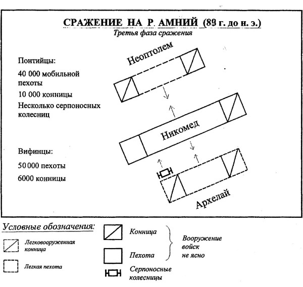Вот как описывает основную стадию боя Аппиан (Mith., 18): «Митрида-товы воины, потесненные Никомедом, бежали до тех пор, пока Архелай, напавши справа, не ударил по преследующим и они не повернулись против него. Он же стал понемногу отходить, чтобы воины Неоптолема могли вернуться из бегства. Когда же он заключил, что отступил достаточно, понтийцы развернулись. И на вифинцев стремительно напали серпоносные колесницы…».