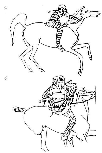 Азиатские конные стрелки. а) Изображение на кубке аттического мастера Триптолема (вероятно, 470-е гг. до н. э.). Воспроизведено по изданию: Head. D. The Achaemenid Persian Army. Stockport, 1992. Fig. 12 b.б) Конный стрелок в панцире греческого типа и фракийской шапке. Краснофигурный кубок из Орвьето (первая половина V в. до н. э.).