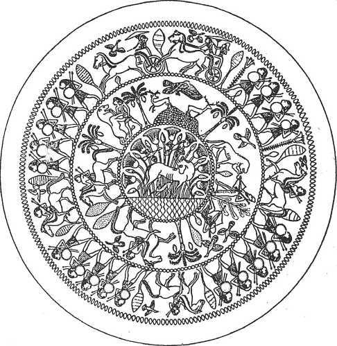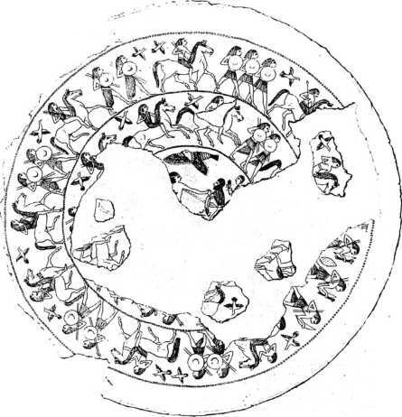 Блюдо финикийской работы (ок. 710–675 гг. до н. э.). Шествие египетских пехотинцев и всадников. В центре традиционная сцена пленения азиата.