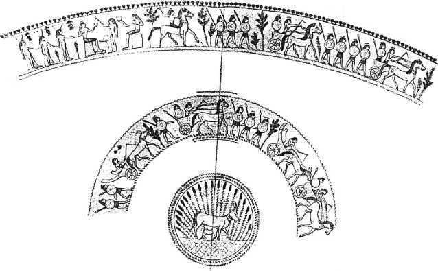Прорисовка чаши финикийской работы (ок. 710–675 гг. до н. э.). На внутреннем регистре (вверху) справа представлены две боевых египетских колесницы сопровождаются отрядами пехоты. Внешний регистр (снизу): египетская колесница в сопровождении повозки, запряженной мулом, и пехотинцами.