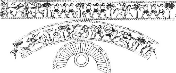 Прорисовка серебрянной чаши финикийской работы неизвестного происхождения (ок. 710–675 гг. до н. э.). Museum of Fine Arts, № 27.170 (Boston). Верхний регистр: колесничий азиат в сопровождении запасной колесницы, которую впереди эскортируют египетские пехотинцы и всадник. Нижний регистр: охота египтян на льва (справа) и на горного козла (слева).