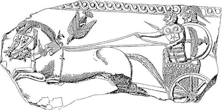 Фрагмент терракоты из Сард (ок. 530–520 гг. до н. э.). Cabinet des médailles, Paris. Колесница ионийского типа с передним и боковыми перилами, кузов, очевидно, плетенный, колесо с восьмью спицами. Возница в кирасе и шлеме из пластинок. Воин с греческим щитом, копьем, в шлеме напоминающем коринфский.