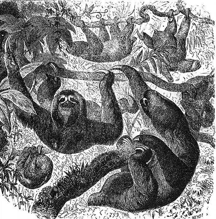 Влажные большие леса составляют любимое местопребывание ленивцев. Здесь, прицепившись вверх ногами к ветвям, эти ленивые существа ведут тихую, скучную жизнь, покидая родное дерево только в случае крайней нужды, за недостатком пищи. Последней служат обыкновенно почки, молодые побеги и плоды; да и к этой пище ленивцы так нетребовательны, что могут голодать целыми днями. При еде они обыкновенно пользуются своими длинными передними конечностями, чтобы, не меняя положения, притягивать к себе ветки. На земле эти жалкие существа чувствуют себя крайне беспомощно, и их способ передвижения, представляющий трудное волочение тела по земле, невольно возбуждает сострадание. Гораздо лучше чувствует себя это животное в воде, где оно искусно плавает, а еще лучше – на деревьях, где настоящая родина его. Ему место на деревьях, как орлу в поднебесье, как рыбе в воде. Только там ленивец, подобно юркой обезьяне, в своей сфере, но разница в том, что обезьяна живет на ветвях, а ленивец под ветвями, подобно летучей мыши. По-видимому, нет ничего неудобнее такого положения, как висеть, уцепившись за сук, а между тем стоит посмотреть, как ловко и уверенно лазает в этой позе животное, чтобы убедиться, что для ленивца путешествовать вверх ногами – дело самое привычное. Спокойно протягивает он одну из передних лап, обхватывает ею сук, переставляет вторую лапу, потом обе задних – и таким образом двигается с искусством, которому мог бы позавидовать первейший акробат.