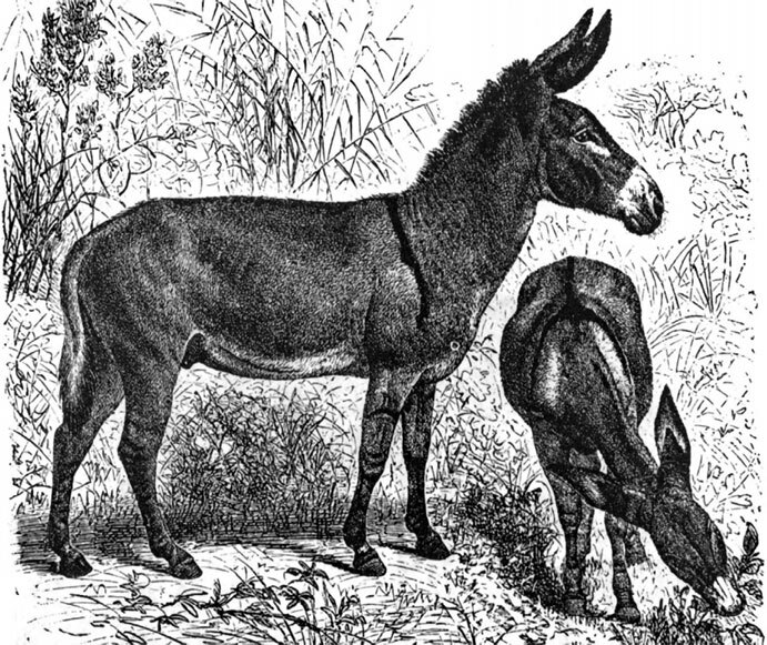 Что касается ослов, то домашний осел происходит от дикого африканского, и теперь еще встречающегося на его родине в двух разновидностях. Первая, степной осел (Е. asinus africanus), похожа на своего ручного потомка в Египте, по нраву же и образу жизни – на своих диких азиатских сородичей. Он – большого роста, красиво сложен, светло-рыжего цвета, с черными полосами (на спине и боках); грива – короткая, прямостоящая, кисть же хвоста – большая, длинная. От степного осла отличают сомалийского осла (Е. as. somalicus), еще больше ростом и с более длинной, отвислой гривой. Он серого цвета с неясной полосой на спине. Первый водится в Нубии, доходя до Красного моря, второй – в стране Сомали. Подобно кулану и онагру, дикие ослы водятся большими стадами и так же быстроноги и пугливы. От этих видов, а может быть, путем скрещивания и с другими, близкими видами, напр. онагром, произошли различные породы домашнего осла, широко распространенного не только в Сев. и Вост. Африке, но и в Средней Азии, Ю. и Ср. Европе и даже далекой Ю. Америке.