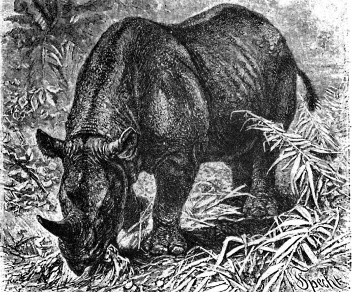 Однажды, по словам Бонция, несколько охотников повстречали на дороге самку индийского носорога вместе с детенышем. Увидев людей, мать поднялась и направилась в чащу, толкая мордой маленького. В это время одному охотнику пришла в голову глупая фантазия: нагнав самку, он начал рубить ее саблей, которая, однако, без вреда отскакивала от толстого панциря громадного толстокожего. Сначала носорог терпеливо переносил эти обиды, но лишь только детеныш был спрятан в кустах, терпение сменилось страшным бешенством. Страшно скрежеща зубами, животное кинулось на обидчика и одним ударом рога разорвало в лохмотья его сапог. Охотник, наверное, погиб бы, если бы его кровная лошадь не повернула назад и не пустилась в галоп. Носорог бросился за ней в погоню, с треском ниспровергая все на своем пути. К счастью, ему встретились на дороге два толстых дерева, с которыми он не мог справиться. Тщетно исступленное чудовище сыпало страшные удары рогом – деревья тряслись, как тростник, но не поддавались. Тем временем охотники окружили его и выстрелами из ружей положили на месте, а затем отыскали в кустах и детеныша.