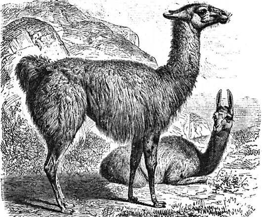 Гуанако, или хуанако (Auchenia huanaco), – самое крупное и одно из важнейших млекопитающих Ю. Америки. По росту оно приблизительно равняется благородному оленю, по внешности же представляет странную смесь овцы с верблюдом. Общая длина тела, считая и 24 см хвост, – 2,25 м, а вышина в плечах – 1,15 м; самки меньше. Туловище гуанако довольно коротко и сжато, голова длинная, с тупой мордой; длинные, узкие ноздри могут закрываться; уши равняются с половину головы и очень подвижны; большие глаза, с поперечным зрачком, оживлены; ноги высокие и стройные, на суставах передних ног нет мозолей, как у верблюдов и других лам. Шерсть длинная, густая, волнистая; состоит из короткого, тонкого подшерстка и более жестких длинных волос ости. Цвет ее – грязно-буровато-рыжий, местами с темно-бурыми пятнами, снизу – беловатый. Распространены гуанако по всем Кордильерам от лесистых островов Огненной Земли до Северного Перу. Живут небольшими стадами в 12–30 штук на горных пастбищах; имеют странную привычку выпускать свой помет в одну общую кучу, так что индейцам, употребляющим его на топливо, нет надобности и трудиться собирать его.