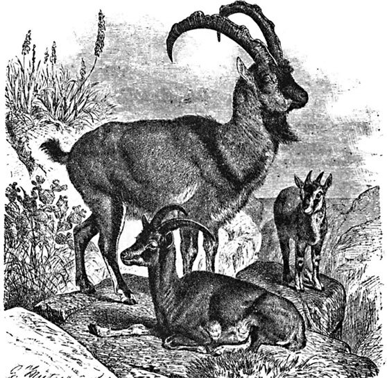 Типичный и самый сильный представитель всей группы козлов – козерог (Ibex) живет на такой высоте в горах, где другие крупные млекопитающие не могли бы существовать. Только в самые сильные холода он спускается в более низкие ложбины, вообще же круглый год пасется на недоступных вершинах. Различают несколько видов козерога, именно козерог альпийский (Capra ibex), живущий в Альпах; пиренейский к. (Capra pyrenaica) в Испанских горах, тур (Capra caucasica), водящийся на Кавказе, беден (С. beden) – в Аравии, вали (С. walie) – в Абиссинии и скайн (С. skyn) – в Гималаях. Но так как все они похожи друг на друга, отличаясь только бородкой и рогами, то многие считают их за один вид.