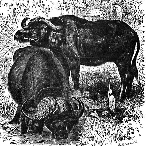 Тем удивительнее огромная разница в нравах обоих животных: в то время как домашний буйвол легко слушается даже слабой руки ребенка, его африканский родственник без всякого преувеличения может быть назван ужаснейшим из всех кровожадных обитателей пустынь и лесов Черного материка! Негры боятся его больше, чем самого льва, больше, чем дикого слона, и храбрейшие из них не осмеливаются охотиться за буйволом.