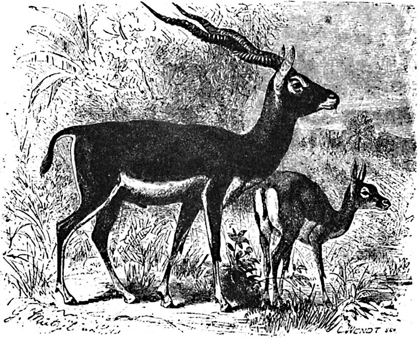 В Индии же по всему Индостану водится и другая не менее замечательная антилопа – четырехрогая (Tetraceros quadricornis), изящное, небольшое животное, всего 70–80 см длиной и 60 вышиной. Отличительными признаками ее являются: большие закругленные уши, длинные слезные ямки, широкий голый кончик носа, стройные ноги, длинный мех, буро-чалый наверху и белый внизу, и особенно рога (только у самцов), задние рога в 10–12 см, а передние – 3–4. Четырехрогая антилопа очень пуглива и вместе с этим зла. Мясо ее сухо.