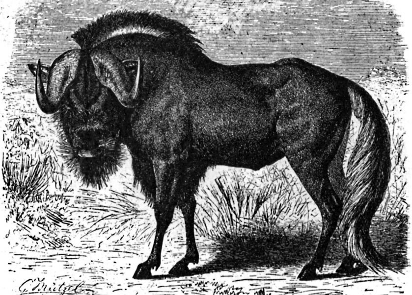 Наконец, заканчивая описание антилоп и вместе с тем всего обширного семейства полорогих, остановимся на гну (Catoblepas), представляющем из себя, пожалуй, самое стройное животное из всех жвачных. В самом деле, полуантилопа, полубык, полулошадь, гну имеет такой вид, что с первого взгляда невозможно решить, к какой группе животных его отнести. По фигуре, хвосту и гриве он похож на лошадь, но его голова, украшенная двумя рогами, гораздо более напоминает бычачью, а раздвоенные копыта усиливают это сходство.