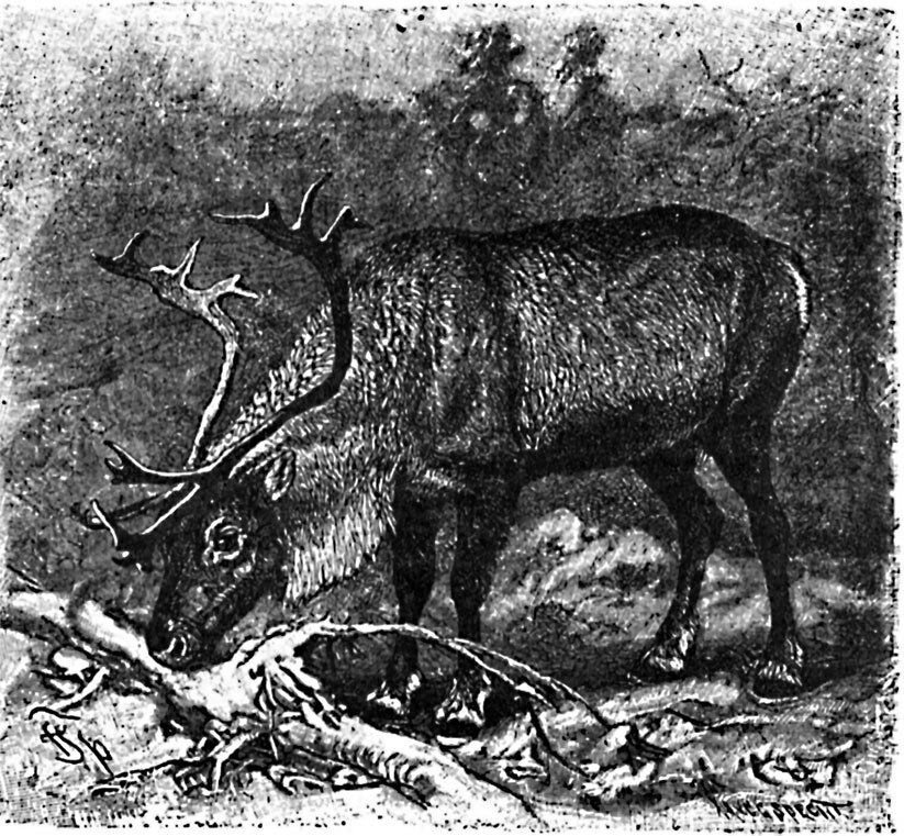 Северный олень – довольно крупное животное. Длина его доходит до 2 м, длина хвоста – 13 см, высота у загривка – около 1 м. Шерсть – густая, длинная, волнистая, темно-бурого цвета у домашнего и серая (зимой – с сединой) у дикого. Встречается это животное севернее 60° и только иногда спускается до 52°, как в Новом, так и в Старом Свете (в Скандинавии, Гренландии, Сибири и т. п.). Подобно серне, он водится только на обширных, покрытых мхом, ягелем (оленьим мхом) и скудной альпийской травой площадям северных гор (в Норвегии – «фиельды»). В Сибири он совершает регулярные путешествия, переходя весной из лесов, где он искал защиты от холодов, в тундры. Здесь к тому времени начинает показываться полярная растительность. Отощавшие за зиму животные жиреют на привольном корму, затем, когда в тундрах летом развиваются тучи комаров, оводов и т. п. насекомых, олени бегут от них в августе – сентябре опять в леса. Такие переселения совершаются обыкновенно большими стадами, причем вся громадная движущаяся масса имеет вид леса, только, понятно, леса без листьев. За оленями гоняются в это время волки и другие хищники, чтобы питаться отставшими, усталыми путешественниками. В горах олени летом, спасаясь от насекомых и жары, поднимаются к глетчерам, а осенью спускаются в низины. Широкие копыта позволяют этим животным так же хорошо ходить по болотистым и снежным местам, как и удерживаться на крутых склонах. Только весной, когда талый снег покрывается ледяной корой (настом), режущей до крови ноги оленей, последним приходится плохо, чем обыкновенно и пользуются волки, легко скользящие по насту. При каждом шаге оленя слышится своеобразный хряст, как бы от хрустения суставов, что в массе производит довольно сильный, странный шум. Затем, олень хорошо плавает и обладает совершенными органами внешних чувств. Но как ни чуток он, как ни осторожен, ему не спастись от своего злейшего врага – человека, который всегда находит тысячи способов убить это благородное животное или обратить его в рабство. Пойманный олень, особенно молодой, быстро ручнеет, но зато при малейшем недосмотре со стороны хозяина быстро опять дичает, как и домашний. Поэтому считать оленя вполне домашним животным нельзя: самые обычные операции, как доение молока, возможны у них только при помощи аркана, которым держат оленью самку.