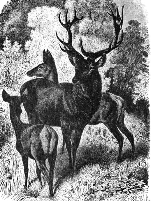 Благородный олень (Cervus elaphus) отличается круглыми стволами и ветвями своих рогов, которые бывают только у самцов. Это – красивое, стройное, изящное животное, с широкой грудью и длинной головой, с живыми глазами, имеющими овальные зрачки. Из слезных ямок их вытекает жирная, кашицеобразная масса. Величина оленя – 1,85–2,15 м, причем 15 см занимает хвост, высота плеч 1,2–1,5; общий вес до 12 пуд. Самки меньше. Шерсть состоит из ости, серовато-бурой зимой и красновато-бурой летом, и пепельно-серого подшерстка.
