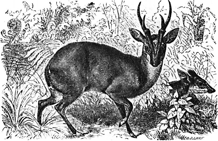 Гораздо меньше косуль – мунджаки (Cervulus), населяющие южные части Азии, начиная с Китая. Эти животные имеют очень короткие, малоразвитые рога, зато поразительно длинные клыки и глубокие, широкие слезные ямки. Самый известный мунджак (С. muntjac) длиной до 120 см, причем хвост 15, и высотой 60–70 см. Это довольно стройное, сильное животное с короткой головой, высокими ногами и коротким, гладким, густым, лохматым мехом темно-желто-бурой окраски. Водятся на Зондских о-вах, а также в Индокитае и Индостане, предпочитая гористые местности. По словам Ходжсона, мунджаки крадутся, как ласки, низко наклонив голову, и умеют пробираться сквозь самую густую чащу. Крик мунджака, хриплый, резкий, звучный лай, слышен днем и ночью. При преследовании этот олень не бежит, а старается только спрятаться, зато, открытый в своем убежище, отчаянно защищается не только рогами, но и зубами, главным образом клыками. В неволе, как настоящий олень, он почти всегда остается вспыльчивым и даже злобным.