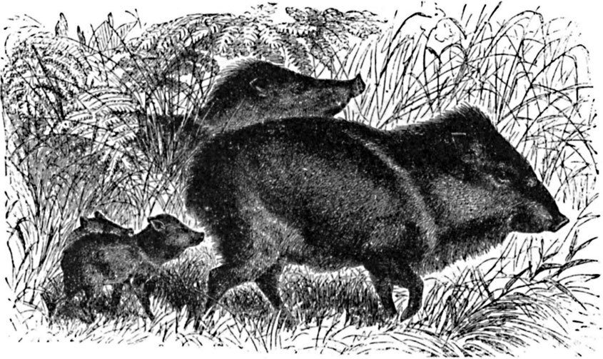 Наконец, в лесах Южной Африки находится особый вид маленьких свиней, известных под именем пекари (Dicotyles). Короткое туловище с заостренным рылом, отсутствие вывороченных кверху клыков, далее, белые полосы на шее и плечах, малоразвитый хвост, трехкопытные задние ноги и присутствие на конце спины особой железы, выделяющей пахучее вещество, сразу выделяют пекари от прочих свиней. Несмотря на свой небольшой рост (около 1 арш.), собственно пекари (D. torquatus) темно-бурого цвета, и 1 1/2 арш. мускусный пекари (D. labiatus) серовато-черного цвета с яркими светлыми пятнами на щеках и, по-видимому, слабое вооружение, пекари являются страшными противниками и для других зверей, и для человека. Сила их заключается в том, что они постоянно ходят большими стадами и нападают без разбора на все, что ни встретится им. Ни реки, ни чаща, ничто не задерживает их дружного, смелого натиска. Все живое спешит обыкновенно спастись бегством от этих свирепых свиней, иначе рискует быть растерзано короткими, но острыми, как бритва, клыками пекари. Вообще чувство общественности развито у пекари более, нежели у других свиней.