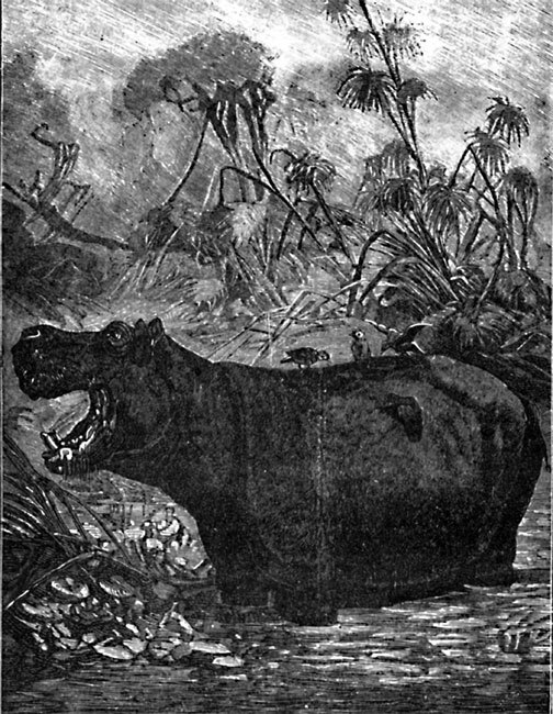 Совсем иначе относятся к бегемоту храбрые негры-язычники. Они роют на пути бегемотов ямы, охотятся на них с гарпунами, врывают на тропинках, по которым ходят чудовища, острые серпообразные ножи, распарывающие бегемотам их волочащееся по земле брюхо, и т. п. Но все эти способы охоты малодействительны, и только ружья белых можно считать серьезно опасными для бегемота, несмотря на его дюймовую кожу.
