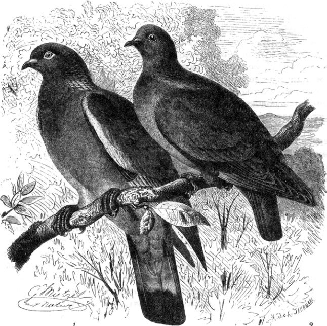 Их 4 семейств голубиных мы остановимся прежде всего на древесных голубях (Columbinae), в ряду которых высшее место принадлежит странствующему голубю (Ectopistes migratorius). Он отличается плотным сложением, средней длины тонким клювом, длинными, острыми крыльями и длинным 12-перым хвостом; общий цвет оперения аспидно-синий, с нижней стороны красновато-серый. Место его обитания – Соединенные Штаты С. Америки.