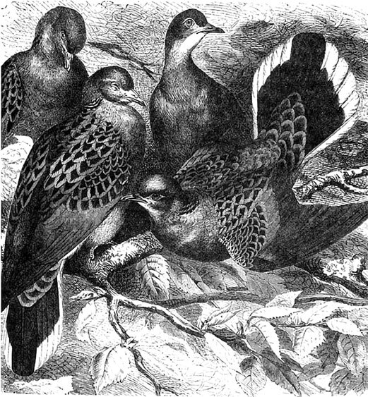 Одюбон описывает место ночлега подобной гигантской стаи в Кентукки, находившееся в высоком лесу, в котором мало росло кустарника. «Солнце уже зашло за горизонт, а мы еще не видели ни одного голубя. Вдруг они появились в отдалении, издавая крыльями шум, напоминавший завывание снежной бури в снастях корабля. Когда они, наконец, приблизились, я почувствовал сильное движение воздуха. Тысячи голубей были мгновенно убиты длинными жердями, но на место их тотчас же появились новые. Тогда были зажжены огни, и перед нашими глазами открылась великолепная, но столь же и отвратительная картина. Голуби, прилетавшие тысячами, садились повсюду, пока кругом ветвей не образовались плотные массы. По временам под их тяжестью с треском ломались ветви, убивая сотни сидящих под ними птиц, которые массами падали на землю. Совершенно бесполезно было говорить или даже кричать стоящему подле соседу; даже ружейные выстрелы замечались только по вспыхиванию заряда на конце ствола».