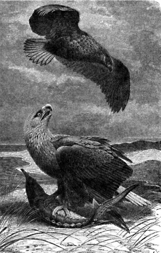 «Чтобы получить понятие об этой птице, перенеситесь на берега Миссисипи в то время, когда приближающаяся зима пригоняет сюда с севера миллионы водяных птиц. Вы увидите здесь орла, величественно сидящего на вершине высочайшего дерева. Своими сверкающими глазами он оглядывает всю окрестность и внимательно прислушивается ко всякому звуку, достигающему до его чуткого слуха. Разные виды уток – шилохвосты, свиязи, кряквы проплывают мимо него, но орлан не трогает их. Но вот доносится издалека дикий, напоминающий звук трубы крик приближающегося лебедя. В тот момент, когда лебедь пролетает мимо опасного хищника, орлан поднимается с ужасным криком, который для лебедя страшнее звука ружейного выстрела. Хищник скользит по воздуху, с быстротой молнии кидается на свою жертву, вонзает в нее свои когти и с непреодолимой силой заставляет ее спуститься вместе с ним на берег. Теперь мы можем убедиться в жестокости этого опаснейшего врага пернатого мира. Выпрямившись над издыхающей жертвой, он сжимает свои могучие лапы и вонзает острые когти глубоко в сердце несчастной птицы; при этом он громкими криками проявляет свою дикую радость, в то время как его жертва судорожно вздрагивает от мучений».