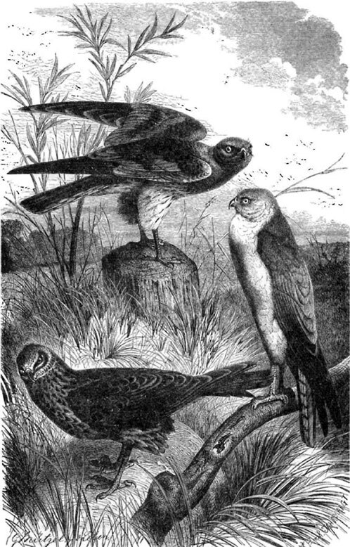Полевой лунь (самка; слева внизу), луговой лунь (вверху), степной лунь (справа внизу)