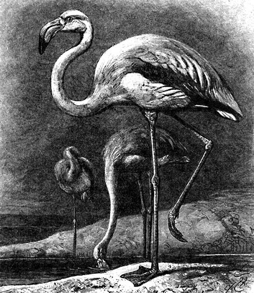 Здесь же уместно рассмотреть и фламинго (Phaenicopteridae), которых прежде относили к особому семейству. Тело фламинго стройное, шея длинная, голова большая; толстый клюв, начиная от середины, загибается под прямым углом; верхняя его половина гораздо меньше и уже нижней и, что особенно замечательно, необыкновенно плоска. Чрезвычайно длинные и тонкие ноги оканчиваются короткими пальцами, соединенными перепонкой; крылья умеренной длины. Оперение мягкое и чрезвычайно красиво окрашенное. Образ жизни 6 видов фламинго, распространенных в Старом Свете и Америке, еще не вполне изучен.