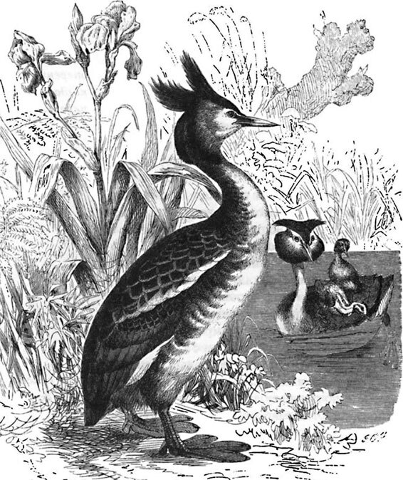 Одна из самых красивых птиц этого семейства – это чомга, хохлатая поганка, кавра (Colymbus cristatus). В брачную пору на голове этой птицы замечается украшение в виде перистого пучка, разделяющегося наверху на два рожка, и длинного воротника, охватывающего бока головы и горло. Верхняя сторона ее тела блестящего черно-бурого цвета, воротник ржаво-красный, нижние части тела блестящего атласно-белого цвета. Начиная от 60° с. ш. к югу, птица эта распространена повсюду в Европе и Ср. Азии, а в качестве зимнего гостя появляется и в Сев. Африке и Китае.
