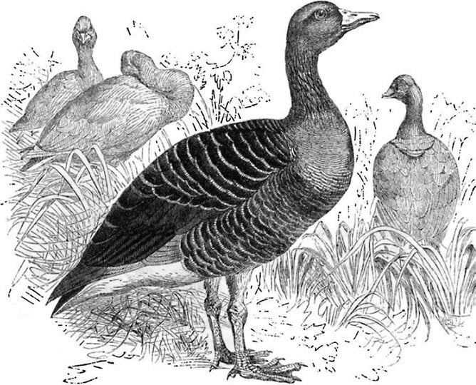 Начнем с дикого, или серого, гуся (Anser ferus), от которого произошли домашние гуси. Цвет его оперения на спине буровато-серый, на нижней части тела желтовато-серый с черными пятнами; перья надхвостья и брюха – белые. Серый гусь свойствен более умеренным странам, нежели дальнему северу; область его распространения обнимает всю Европу и Азию между 70 и 45° с. ш.; он предпочитает болота, перемежающиеся с обширными водными пространствами, или труднодоступные островки, густо поросшие травой, камышом и кустарником.