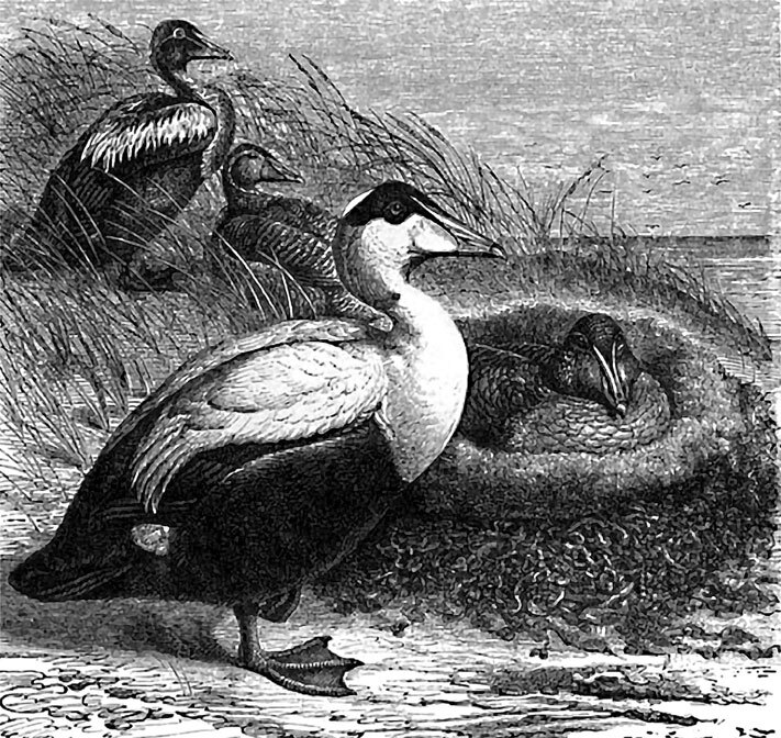 Самое гнездо свивается очень небрежно из тонкого хвороста, травы или соломы, но зато густо выстилается пухом, который гага по миновании надобности великодушно оставляет человеку в награду за его заботы о ее благополучии. Кладка состоит из 6–8 яиц. Если самку не тревожить, то она каждое утро оставляет гнездо, бережно прикрыв яйца пухом, и летит на море для добывания пищи; набив свой зоб ракушками так, что он чуть не лопается, она опять возвращается к гнезду. По истечении 25–26 дней вылупляются птенцы – прелестные маленькие существа, которые с первого же дня своей жизни проворно плавают, ныряют и довольно хорошо, во всяком случае лучше матери, бегают. Если убить самку, прежде чем птенцы достаточно подрастут, то они присоединяются к другой стае птенцов и находят в их родительнице вторую мать. Вообще у гаги сильно заметно влечение к материнским обязанностям; самки, высиживающие одна возле другой, нередко воруют друг у друга яйца и если соединяются вместе, то беспрекословно делят между собой заботы о воспитании детей.
