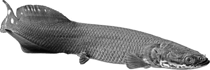 В пресных водах Гвианы водится гигантская рыба арапайма (Arapaima gigas), которая принадлежит к небольшому семейству костеязычных рыб (Osteoglossidae); длина ее достигает 4 м, а вес до 200 кг. Тело массивное, покрытое крупными чешуями. Ловят эту огромную рыбу или на удочку, или убивают стрелами из лука. Как происходит ловля на удочку, видно из следующего рассказа Шомбурга.