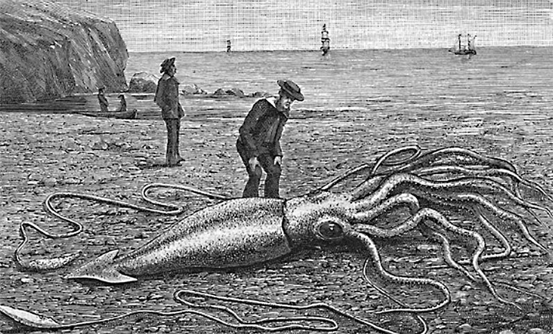 С давних времен существовало множество рассказов о гигантских головоногих моллюсках, которые не только опасны человеку, но могут потопить даже корабль. С тех пор как естествознание вступило на почву точного исследования, все подобные рассказы огульно относились к области вымыслов, и натуралисты не допускали существования этих животных, превышающих в размере 3–4 фут., каковые экземпляры часто встречаются в европейских морях. Однако в позднейшее время пришлось допустить, что в океанических глубинах действительно водятся гигантские чудовища. Еще Аристотель сообщал об одном кальмаре, который, по его словам, имел 5 локтей в длину, а у Плиния приведен рассказ Требия-Нигера, что однажды ночью в Кратее у берега появился исполинский «полип», который привел в ужас всех рыбаков и своим страшным фырканьем и размахиванием рук разогнал даже всех собак. Голова этого чудовища доставлена была Лукуллу и по величине достигала 15 амфор; его руки были длиной в 30 фут. и такой толщины, что человек с трудом мог обхватить каждую из них; даже присоски были такой величины, что в каждую можно было влить урну воды.