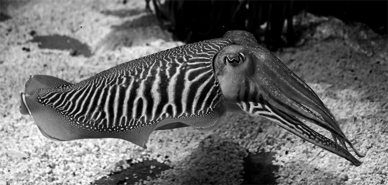 К десятиногим относится также каракатица (Sepia), или сепия. Тело ее округлое, слегка вытянутое и немного сплюснутое; руки сравнительно коротки, но хватательные – длинные; спинная пластинка на переднем конце заострена, а на заднем расширяется и имеет вырезку. В пластинке можно различать три слоя: наружный – известковый, очень тонкий, покрытый мелкими бугорками, средний – роговой, а третий состоит из известковых пластинок. Когда животное находится в спокойном состоянии, то цвет его розовато-желтый, переливающийся почти всеми цветами радуги; на голове окраска несколько ярче, руки зеленоватого цвета. При раздражении на теле появляется множество бугорков и бородавок, окраска быстро меняется, глаза ярко сверкают. У вынутой из воды каракатицы на спине появляются полоски, кожа желтеет, но постепенно все краски бледнеют. Глаза имеют очень странное устройство, в особенности зрачок, который в обыкновенном состоянии представляется в виде греческой буквы ω.