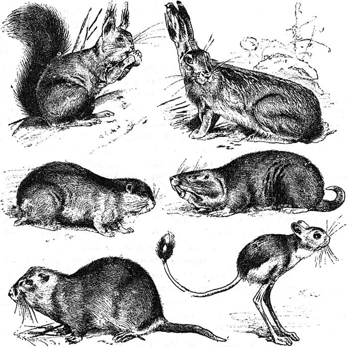 Белка, заяц (верхний ряд); лемминг, гоффер (средний ряд); болотный бобр, египетский тушканчик (нижний ряд)
