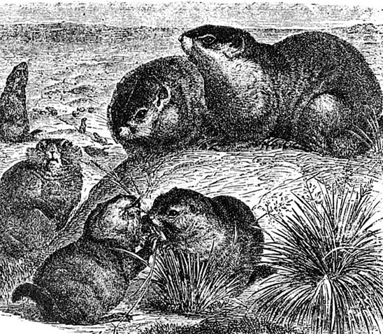 Замечательное зрелище представляет собой такое поселение, если наблюдать его вблизи, счастливо пробравшись туда незамеченным зоркой стражей. Всюду, куда ни кинешь взор, кипит оживленная деятельность. Почти на каждом холмике сидит, выпрямившись по-беличьи, маленький желтовато-бурый зверек, поднятый вверх хвостик которого находится в постоянном движении, и тысячи тонких лающих голосов соединяются в настоящий визг. Но стоит лишь человеку, сидящему в засаде, сделать неосторожное движение, как все общество трусливо и моментально скрывается в своих темных ходах. Только тихий лай, глухо раздающийся из глубины земли, да множество стоящих на поверхности земли холмиков, свидетельствуют о густой населенности этого государства».
