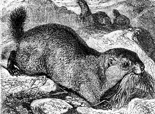 В противоположность байбаку, жителю равнин, близкий родственник его, альпийский сурок (A. marmota), предпочитает высочайшие каменистые склоны Альп, Пиренеев и Карпат, где не растет ни дерева, ни куста и где снег оттаивает только на 6 недель. Это животное имеет до 51 см в длину и хвост в 11 см. Состоящая из более короткого подшерстка и длинной ости шерсть сурка окрашена на спинке в буро-черный цвет, на животе же – темно-красновато-бурая, а на морде и ногах – ржаво-желтая. Любимое его местопребывание – открытые места, окруженные скалами, или ущелья. Здесь сурок выкапывает себе несколько маленьких, но глубоких нор: одни для летнего пребывания, другие – для зимнего. Вследствие суровости зим, царящих на этих высотах, деятельная жизнь нашего зверька продолжается иногда всего два месяца, остальное время он проводит в спячке. Запасы его пищи составляет обыкновенно сено; летом же он, конечно, предпочитает свежую траву, которую, подобно белкам, держит передними лапами.