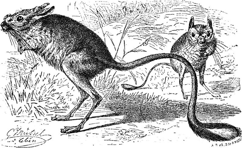 Тушканчиковые (Dipodidae) напоминают по внешнему виду кенгуру. Задние ноги с 3 пальцами почти втрое длиннее маленьких пятипалых передних, хвост также очень большой, на самом конце разделен на 2 кисточки. Но голова уже отличается от кенгуровой: она очень толста и снабжена длинными усами, иногда достигающими длины самого тела. Благодаря своим длинным задним ногам эти животные легко делают прыжки, раз в 20 превышающие длину их тела. Живые, прелестные, большие глаза сразу указывают на ночной образ жизни тушканчиков; ложкообразные уши бывают от одной трети до величины целой головы; шея – очень толстая и неподвижная, но туловище стройное. У всех видов шерсть – густая, мягкая и окрашена обыкновенно под цвет песка. Большая часть этих грациозных животных живет в Африке и Азии, но некоторые виды переходят и в Европу, а один вид распространен в Сев. Америке. Везде любимым местопребыванием им служат сухие, песчаные равнины или травянистые степи. Жилища их – неглубокие норы с большим числом выходов. Здесь они проводят большую часть дня и только с закатом солнца появляются на поверхности Земли. Пища их по преимуществу зерна, луковицы, корни, трава и пр. Но некоторые виды едят насекомых, млекопитающих и даже друг друга.