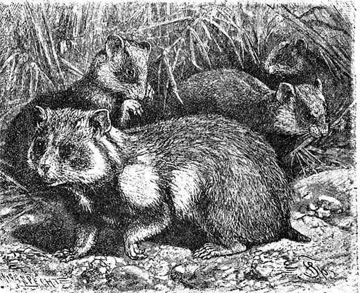 Последнюю группу семейства мышей составляют хомяки, неуклюжие, толстые животные, с расщепленными губами, большими защечными мешками и 3 коренными зубами на каждой стороне челюстей. Зубов всего – 16; ноги – короткие, также и хвост. Довольно красивый по наружности, но безобразный по характеру – ворчливый, раздражительный и вместе отважный хомяк (Cricetus frumentarius) достигает 30 см в длину, причем хвост только 5 см. Общие признаки его: коренастое тело, довольно заостренная голова, кожистые уши средней величины, большие, блестящие глаза, короткие ноги со светлыми, короткими когтями и конически заостренный хвост. Густой, гладкий, слегка блестящий мех его состоит из короткого, мягкого подшерстка и из более длинных и жестких, редких волос ости. Туловище сверху обыкновенно окрашено в светло-желто-бурый цвет, а верхняя сторона рыльца, глазная область и шея – в красно-бурый; на щеках – желтые пятна, а живот и ноги большей частью – черные, хотя ступни ног – белые. Встречаются разновидности черного, матово-желтого и др. цветов. Область обитания хомяка простирается от Рейна до Оби, причем необходимым условием является, по-видимому, твердая, сухая, но плодородная почва.