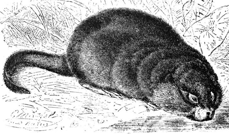 Один из замечательных видов – мускусная крыса, или ондатра (Fiber zibethicus), животное до 58 см в длину, причем половину занимает хвост, с широкими задними ногами, тупой мордой и с замыкающимися, покрытыми короткими полосами, ушами. На передних ногах 4 пальца и бородавка вместо пятого, на задних, которые гораздо длиннее первых, – 5. Мех густой, мягкий, блестящий, окрашенный в темно-бурый цвет, живот – серый, хвост черный. Выделяет пахучую жидкость с мускусным запахом. Встречается на севере Америки между 36 и 69° с. ш., в больших озерах, болотах и тихих ручьях. По образу жизни ондатра напоминает бобра, отчего индейцы называют этих животных братьями, признавая бобра старше и умнее, а ондатру – глупее. Постройки мускусной крысы представляют или котловидные углубления под землей с подводными выходами, или выдаются над поверхностью воды. В последнем случае проход оканчивается на поверхности воды. Стенки гнезда построены из тростника, осоки и смазаны илом. Когда настает суровая зима и крысам не удается проделать отверстие в воду, много их задыхается в своих убежищах. Пища их состоит большей частью из болотных растений, но они нападают также на соседние плантации, опустошая огороды. В воде резвящиеся ондатры представляют очень красивую картину. Человек преследует этого зверька из-за меха, находящего сбыт в Америке, Китае, а также в России, где его продают под названием выхухоли.