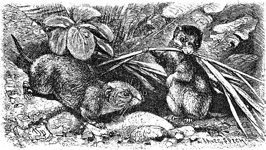 Гораздо привлекательнее этих видов ловкая, подвижная и веселая мышь-малютка (Mus minutus), всего 13 см в длину, из которых почти половина приходится на хвост. Верхняя часть ее тела и хвост – желтовато-буро-красные, живот и ноги – совершенно белые. Распространена начиная от Сибири до Франции, Англии и Италии. Она не только быстро бегает, но и отлично лазает по стеблям трав. Кроме того, замечательно еще, что она очень искусно строит свое гнездо, похожее на птичье. Оно сплетается из расщепленных на волокна листьев злаков, а внутри устилается пухом болотных трав, пушинками верб и т. п. Рождает 2–3 раза в год по 5–9 штук детенышей.