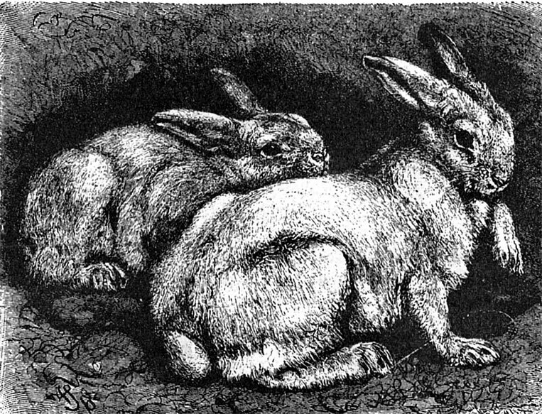 Кролик (Lepus cuniculus), в отличие от настоящих зайцев, меньше ростом, более тонкого сложения, имеет более короткие голову, уши и задние ноги. Длина – до 40 см, из которых 7 занимает хвост. Хвост сверху черный, снизу белый, остальное же тело одето серым мехом, сверху желто-бурого оттенка, переходящего на нижней стороне в чисто белый. Шея частью – ржаво-желто-серая, частью – ржаво-рыжая. Первоначальное его отечество – Испания, а теперь он распространен по всей Средней и Южной Европе. Любимое местопребывание его – холмистые и песчаные местности с лощинами, поросшими кустарником. Здесь он устраивает себе простые норы, поселяясь целыми обществами; впрочем, каждая пара имеет свое особое логовище.