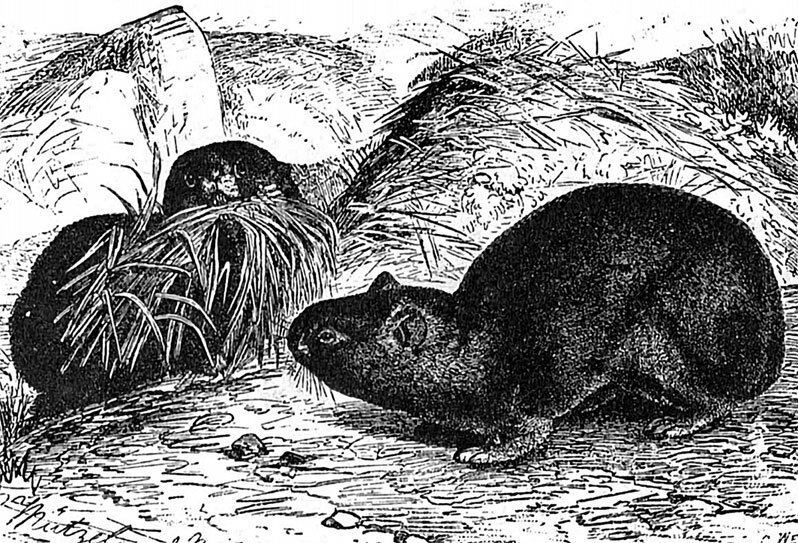 Гораздо оригинальнее встречающаяся в Патагонии и других пустынных странах Южной Америки мара (Dolichotis potagonica); это животное длиной в 50 см и высотой в 45 см напоминает по внешности зайца, но отличается от него более высокими ногами и более короткими тупыми ушами. На довольно тощей шее сидит сверху приплюснутая, а у морды заостренная голова с живыми глазами. Мягкий, густой, глянцевитый мех окрашен сверху в буро-серый цвет с тонкими белыми крапинами, нижняя же сторона – белая. Зверек живет в норах, выходя на добычу днем. Пищей ему служат скудные травы Патагонии. Животное очень пугливо, но в неволе быстро привыкает к человеку. Геринг рассказывает про одну ручную мару, которая была очень чувствительна к ласкам: когда ее слегка чесали пальцами, она выгибала спину, сопровождая это в высшей степени довольным, но непередаваемо странным не то писком, не то хрюканьем, в котором слышалось, однако, что-то трогательное и располагающее. На свободе, благодаря своим тонким чувствам, мара нелегко позволяет заставать себя в логовище, но охотник на лошади всегда может нагнать ее, так как продолжительный бег утомляет ее. Туземцы охотятся за ней главным образом из-за меха, идущего на ковры и одеяла.