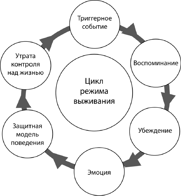 Триггерное событие вызывает в нашей памяти эмоционально окрашенное воспоминание. Оно превращается в убеждение, которое, в свою очередь, влияет на наше восприятие действительности, эмоции и поступки. Пытаясь почувствовать себя в безопасности, мы прибегаем к защитным моделям поведения и утрачиваем контроль над собственной жизнью и душевное равновесие. В таком состоянии даже самое незначительное событие способно стать триггером и спровоцировать новый виток цикла.