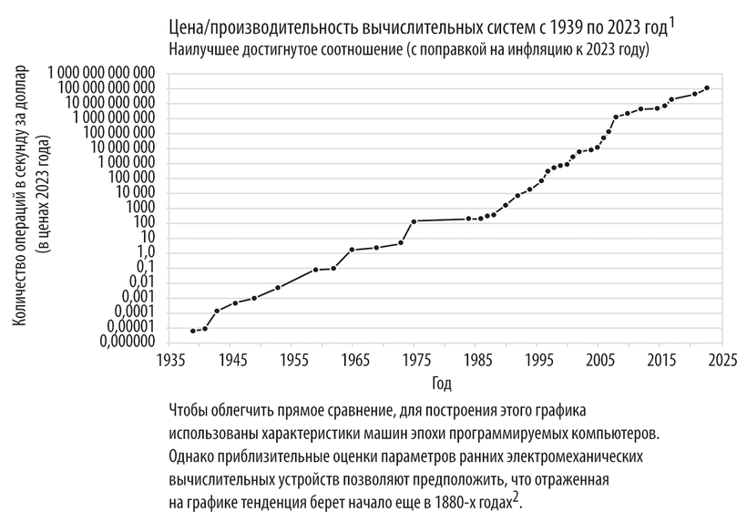 На рисунке, который мы подробно обсудим в следующих главах, показан ключевой фактор, способствующий нашему техническому прогрессу. Это экспоненциальный рост вычислительной мощности, доступной за один доллар, который представлен прямой линией в логарифмических координатах на длительном временном интервале. Как известно, закон Мура гласит, что размер транзисторов постоянно уменьшается, что делает компьютеры все более быстрыми. Однако это лишь одно из проявлений закона ускорения отдачи, который действовал задолго до изобретения транзисторов и будет действовать даже после того, как дальнейшее развитие транзисторов станет физически невозможным и на смену им придут новые технологии. Закономерность, представленная на этом рисунке, сформировала современный облик нашего мира. Практически каждый прорыв в развитии, о котором мы расскажем в этой книге, прямо или косвенно связан с этим фактом.