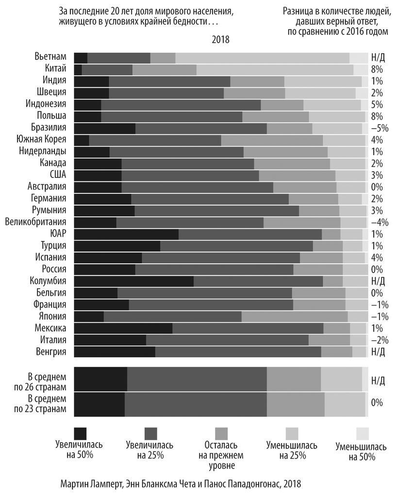 В качестве еще одного примера приведем данные исследования, проведенного в 2018 году36 в 26 странах, где проживает 63 % населения мира. Исследование было проведено на 17 различных языках, а в опросе приняли участие 31 786 человек. Целью опроса было выяснить, увеличилось или уменьшилось количество бедных людей в мире за последние 20 лет и на сколько. Результаты опроса представлены на графике.