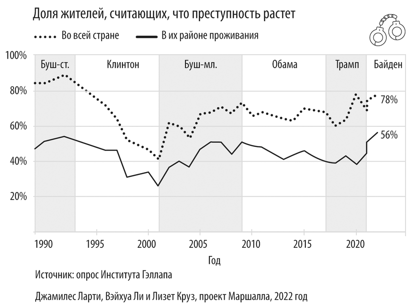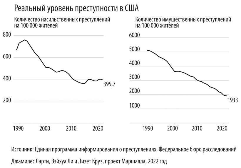 Аналогичное явление наблюдается и по другую сторону Атлантического океана. С начала XXI века подавляющее большинство американцев – до 78 % – считает, что уровень преступности в стране ежегодно растет по сравнению с предыдущем годом. Однако на самом деле количество насильственных преступлений и краж имущества с 1990 года сократилось примерно вдвое38.