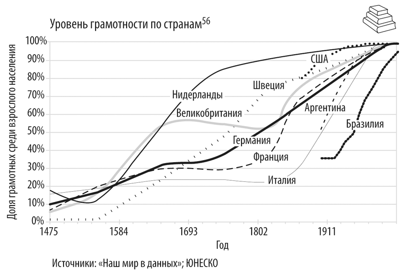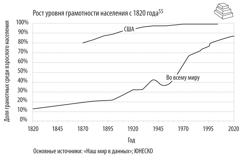 К концу Средневековья в Европе появилось важное изобретение – передвижной печатный станок. Это открытие положило начало широкому распространению недорогой и разнообразной печатной продукции, что для людей послужило стимулом научиться читать. На тот момент грамоте было обучено менее одной пятой населения Европы44, в основном духовенство и представители профессий, для которых это было необходимо45. В эпоху Просвещения умение читать стало более распространенным, но к 1750 году только в Голландии и Великобритании более половины жителей были грамотными46. Однако уже к 1870 году отстающими по этому показателю были лишь Испания и Италия, в основном из-за сравнительно неразвитой экономики и недавних гражданских войн47. За пределами Европы ситуация была хуже. В 1800 году в мире умели читать менее одного человека из десяти. Однако в XIX веке растущая популярность газет способствовала повышению уровня грамотности, а социальные преобразования постепенно открывали детям доступ к образованию48. Тем не менее к 1900 году уровень грамотности в мире оставался относительно низким: меньше четверти людей были грамотными49. В XX веке обязательное образование распространилось почти повсеместно, и уже к 1910 году уровень грамотности в мире был выше 25 %. К 1970 году большая часть населения планеты умела читать50, и эта тенденция продолжила стремительно развиваться51. На сегодняшний день 87 % людей в мире умеют читать, а в развитых странах этот показатель достигает 99 %52.