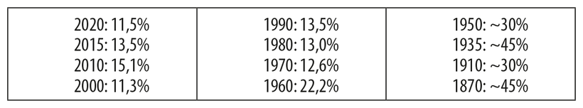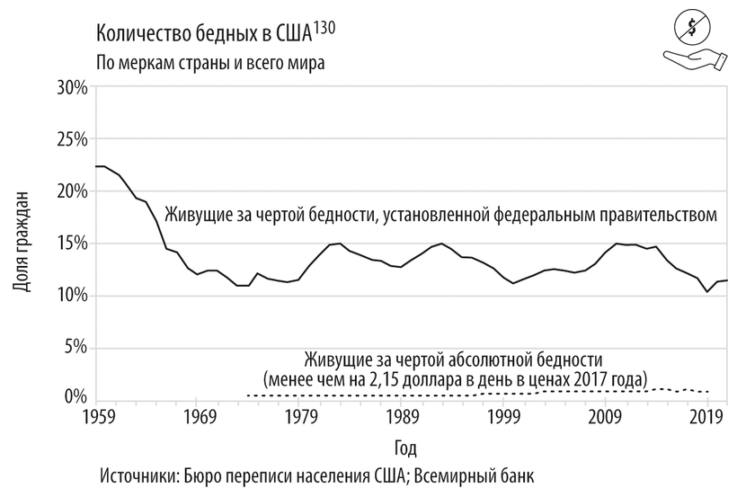 В Соединенных Штатах количество людей, живущих за чертой абсолютной бедности (в соответствии с международным критерием, то есть на 2 доллара 15 центов или меньше в день), не превышало 1,2 % с начала статистических наблюдений121. Что касается относительно бедных (по меркам общества конкретной страны), статистика рисует другую картину. Относительная бедность в США снизилась с 45 % в XIX веке до 12,5 % в 1970 году, причем самые быстрые темпы снижения наблюдались в годы после Второй мировой войны. Однако с тех пор существенного улучшения ситуации не произошло, и этот показатель остается относительно стабильным122, претерпевая небольшие колебания123 в зависимости от состояния экономики124. Одной из причин этого является постоянное повышение черты относительной бедности из-за глобального улучшения условий жизни. Поэтому люди, которые не считались бы бедными по меркам 1980-х, сейчас являются таковыми125.