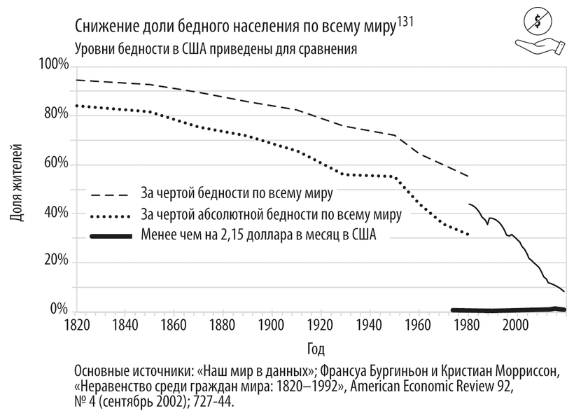 В глобальном масштабе тенденция к улучшению экономического положения удивительно устойчива. В 1820 году около 84 % населения планеты, по современным меркам, жили в полной нищете113. Однако благодаря индустриализации уровень бедности в Европе и Америке постепенно начал снижаться114. Этот процесс существенно ускорился после Второй мировой войны, так как в последующие десятилетия в Индии и Китае начали активно внедряться современные аграрные технологии115. В СМИ стало появляться все больше репортажей о людях со всего мира, живущих за чертой бедности, что создавало у жителей развитых стран искаженное впечатление о масштабах проблемы. Между тем за следующие 30 лет ситуация ощутимо улучшилась. К 2019 году число нищих (то есть людей, живущих меньше чем на 2 доллара 15 центов в день в ценах 2017 года) по всему миру сократилось до примерно 8,4 %. Только в период с 1990 по 2013 год этот показатель уменьшился в три раза116.